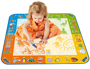 Это полноценный набор для творчества, в который входит сам коврик и ручка, заполняемая водой. Такая игрушка рассчитана на многократное использование благодаря тому, что по мере высыхания рисунков, рисовать можно снова и снова. Ограничения по времени его использования нет.По краям коврика имеются изображения различных форм и красочных символов для копирования и вдохновения. Можно учиться писать буквы английского алфавита и цифры, напечатанные по периметру. Предназначен коврик для детей в возрасте от полутора до пяти-шести лет. Материалы, из которых изготовлен коврик: 65 % полиэстера, 35 % хлопка, полихлоридвинил.
