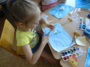 Воспитатель: Если мы нанесём краску на смоченный водой лист, то изображение получится размытым, будет переливаться разными оттенками. Но из чего можно сделать камешки и водоросли, которые находятся ближе к нам? (Дети предлагают использовать крепированную бумагу.) Для водорослей мы скрутим её в жгутики, а для камешков свернём в комочки. Можно ли приклеивать водоросли и камешки к ещё не просохшему фону?