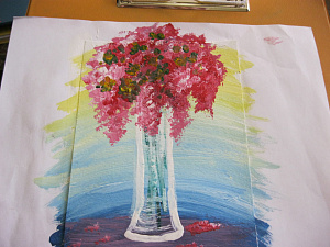 Подождем минутку, когда контуры вазы просохнут и нарисуем стебли наших цветов (рис. 3). Теперь можно рисовать цветы, например, сирень. Для этого «распушим» нашу среднюю кисточку (просто покрутив её по палитре-тарелке), наберём немного белой и малиновой краски, и легко постукивая по «холсту», изобразим гроздья сирени. Важно помнить, что источник света у нас – слева и сверху. Поэтому добавляем лёгкие мазки кистью с белой краской на наши гроздья сирени слева и сверху. Если добавить немного тёмной малиновой краски, то сирень станет объёмной (рис. 4). Маленькой кисточкой проводим 2–3 белых вертикальных штриха в вазе и 3–4 горизонтальных плавных штриха — покажем фактуру стекла и объём вазы (рис. 5). Нарисуем зелёные листочки сирени маленькой кисточкой, просто касаясь «холста», и наш подарок готов (рис. 6)!