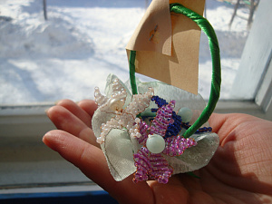 Начинаем с рассматривания, обследования всех необходимых для работы материалов, знакомства детей с техникой безопасности в работе с бисером, проволокой, леской. Осваивать техники плетения мы начинали из мелких бусин и крупного бисера, некоторым детям было очень сложно удерживать пальцами мелкие бисеринки, настолько слабы были их пальчики. Нанизывали материал на проволоку – работа с проволокой безопасна для детей, так как не требуются иголки, а ещё это очень податливый материал, и изделиям легко придать любую форму.