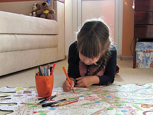 Вдобавок к этим правилам, кружочки, которыми помечен путь, различаются по цвету: зелёные символизируют обычные клетки. А вот если фишка игрока попадёт на голубой кружочек, тогда ему надо будет тянуть карточку с картинкой из отдельной стопки. Для голубых кружочков мы сделали игру на внимание. Пока остальные участники вслух считают до пяти, игроку нужно отыскать точно такую же картинку на поле. Так как раскраска большая, элементов на ней много, найти сразу зайку или коньки совсем непросто. Да-да, это почти маджонг. Успеет игрок найти — получит приз (конфетку или мандаринку). А если он не уложится в отведённое время, тогда приз получит тот игрок, который первым найдёт нужное изображение.