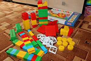 Недавно мы выиграли в конкурсе большой пакет конструктора «Городок» от Stellar. В наборе 100 деталей, из них две тележки-основы для постройки машин и прочего транспорта. В наборе ещё были двери и окна для домов, 4 части крыши.