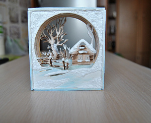 Мы немного усложнили рабочий процесс, и в начале сборки раскрасили все заготовки бело-голубым, коричневым и жёлто-оранжевым цветами. А после соединения всех элементов (использовали клей) добавили нашей модели объёма с помощью жидкого гипса, нанеся его на картинку при помощи деревянной палочки. После застывания раствора, также раскрасили получившиеся сугробы акриловыми красками на водной основе, а по окончанию работы, полученную многослойную 3D-открытку покрыли акриловым лаком.