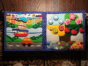 Назначение: изучение видов транспорта (наземный, водный, воздушный), его характеристики, количественный и порядковый счёт, развивать умение составлять описательный рассказ предмета, учить называть части предметов. Можно попросить ребёнка назвать представленные в книжке виды транспорта, что он делает (машина едет, самолёт летит) и для чего он нужен (перевозит груз, пассажиров). Спросить, какой ещё транспорт он знает. Ребёнок может двигать весь транспорт. Можно посчитать цветочки и домики.Материал: фетр, люверсы (оформление отверстий), пуговицы, сутажный шнур.
