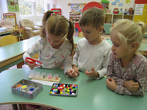 Ход игры: ребёнок с помощью пинцета должен собрать все помпоны нужного цвета в баночку и завинтить её крышечкой того же цвета.