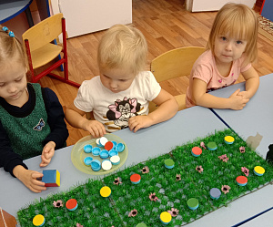 Цель: закреплять с детьми названия основных цветов (красный, синий, жёлтый, зелёный), развивать память, внимание, речь детей.Задачи: учить детей правильно, узнавать и называть основные цвета; развивать зрительное (сенсорное) восприятие, мелкую моторику пальцев рук; развивать познавательные процессы; воспитывать культуру игры (соблюдение правил и последовательности).