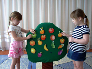 На столе перед деревом расположены карточки овощей и фруктов разного цвета. Педагог просит прикрепить к дереву карточки одного цвета (только красные, жёлтые или зелёные). Для детей младшего дошкольного возраста можно прикрепить на дерево образец с цветом и попросить ребёнка найти и прикрепить карточки такого же цвета.