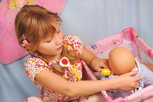 Девчушка с удовольствием пеленает куклу, кормит её с ложечки, укачивает в коляске и учит правилам хорошего поведения. Так она готовится к взрослой жизни.От имитации к импровизации
