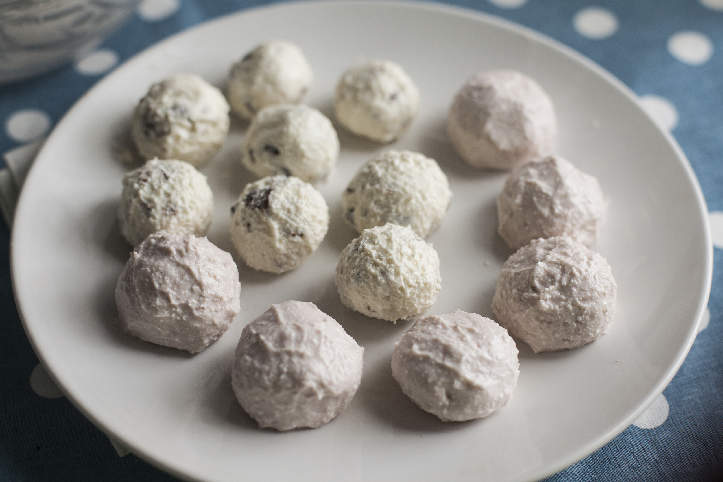Шаг 2: Смоченными в воде руками сформируйте из творожной массы шарики (это будут конфеты) или колбаски (шоколадные батончики) и выложите на тарелку, отправьте в холодильник на час или на мороз на 15 минут.