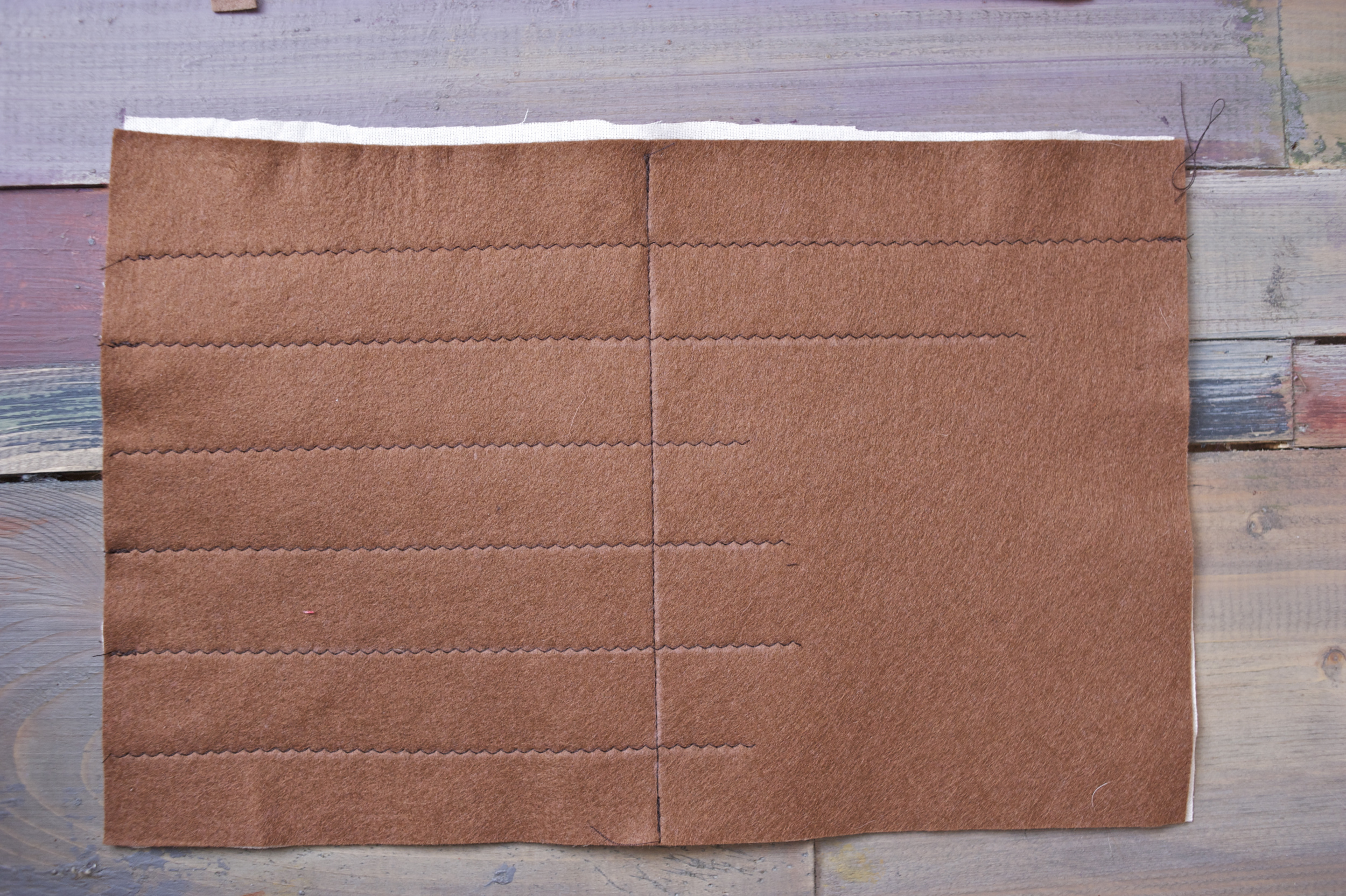 1. Для книжки понадобятся два листа разного цвета: один станет обложкой, другой — внутренними стенами домика. Поскольку мы делаем избушку, я выбрала спокойный коричневый цвет, похожий на состарившиеся брёвна. Берём один лист, делим его на две половинки, как листочки у книжки. Проводим линию мелом. Затем размечаем «брёвна» с помощью линейки. По линиям делаем строчки, шьём любым известным швом. Чтобы сэкономить силы, можно не делать швы там, где у нас будет печка.