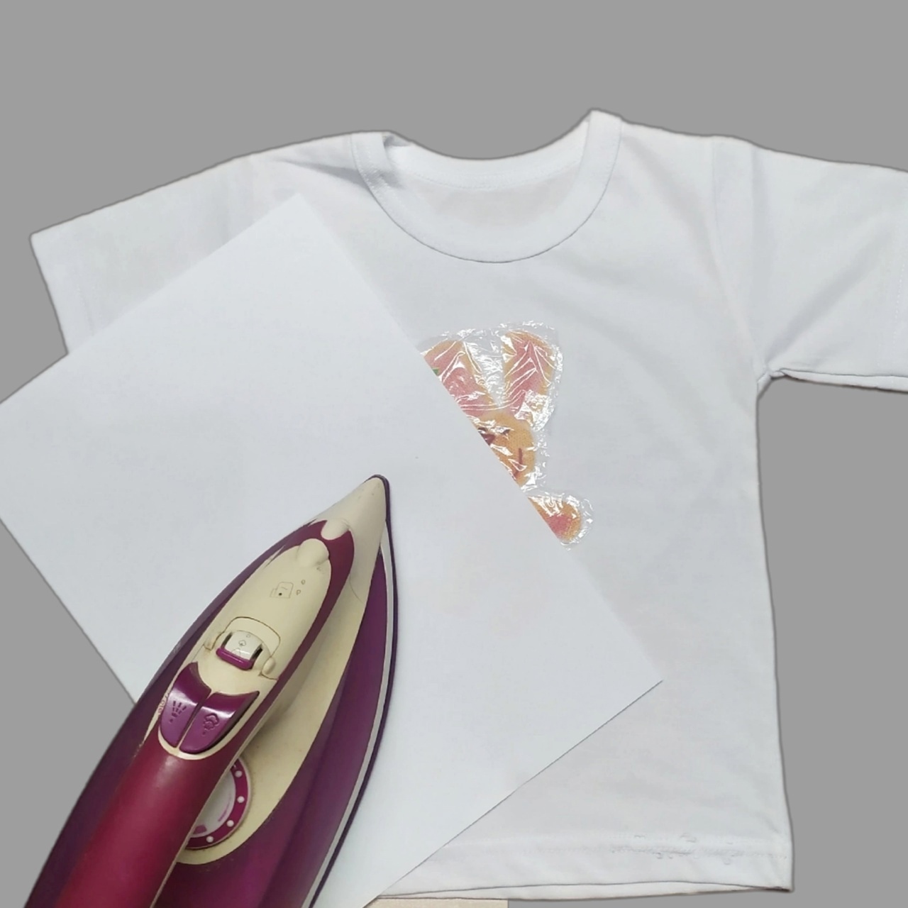 6. Аккуратно прогладьте нагретым утюгом, чтобы упаковочная плёнка нагрелась и прилипла к футболке. Внимание (!) Будьте аккуратны, работая с утюгом. Пусть это сделает взрослый.