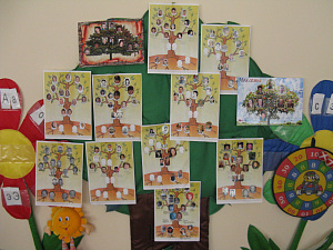 Выполненные работы дети приносят в детский сад, и мы размещаем их на «дереве знаний» в нашей группе. Оно находится в доступном для детей месте, и в свободное время они могут подходить, рассматривать фотографии и рассказывать друг другу о своей семье. Генеалогическое древо является незаменимым наглядным материалом, позволяющим ребёнку интереснее и увлекательнее составлять рассказ о своей семье.