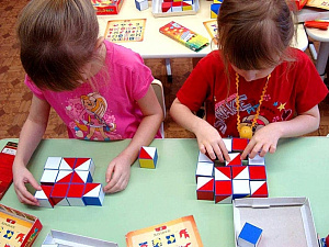 Сложи узор – это многофункциональная игра, развивающая пространственное, логическое и творческое мышление, внимание, память и воображение. В комплект входят 16 одинаковых кубиков, грани которых окрашены в четыре цвета (красный, жёлтый, синий, белый), методические рекомендации родителям и педагогам, примеры узоров.Игра «Логическая задача». Для игры необходимо подготовить игровое поле из листа плотного картона – квадрат со стороной 15 см, разделённый на 9 маленьких квадратов (3х3). У ребёнка 9 кубиков. Задача – расставить кубики в квадрате таким образом, чтобы в каждой строчке и в каждом столбике цвет верхней грани кубика встречался только один раз. Например, один синий, один красный, один жёлтый.