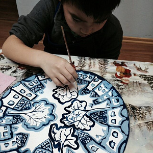 Гжельский городок. Зимняя роспись на круге