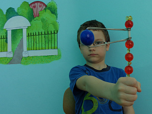 Зрительно-моторная координация – это согласованное действие руки и глаза, при котором глаз выполняет контролирующую функцию, то есть прослеживает движение объекта. В детском саду №28 «Хрусталик» при лечении косоглазия (сходящегося и расходящегося) и амблиопии используются компьютерные упражнения, содержащие тест – объекты красного и синего цветов, воспринимаемые каждым глазом. Задача заключается в том, чтобы как можно точнее совместить объекты, осуществить смещение центров двух объектов друг относительно друга по горизонтальной и вертикальной оси. В данном случае все действия ребёнком производятся на плоском экране. С учётом всех этих особенностей была создана объёмная игра «Шарики» из бросовых материалов (проволока стальная, жёлтые пуговицы, крупные красные бусинки, деревянные шарики, спица для вязания на которую все детали нанизывались).