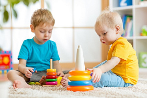 Первый этап. С 1 года до 1 года 3 месяцев. В этом возрасте малыш учится нанизывать кольца на стержень и снимать их со стержня (стержень пирамидки — в вертикальном положении). Для малыша этого возраста самой подходящей будет пирамидка из 4-5 колец одинакового размера. Как только малыш будет легко нанизывать 5 колечек, можно увеличить количество колечек до 10 (одного размера). Обычно для таких игр используются деревянные пирамидки с кольцами небольшого размера (3-5 см).