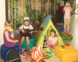 - Музыкальная зона (музыкальные и шумовые инструменты, микрофон, магнитофон, записи с разными мелодиями, караоке) — в группах и музыкальном зале.