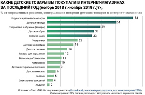 В ноябре 2019 года агентство «РБК Исследования рынков» провело опрос среди онлайн-покупателей детских товаров, с целью выявить наиболее популярные товарные категории для маленьких россиян, приобретаемые через интернет.