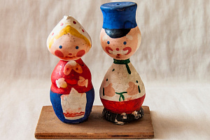 Давайте поговорим о следующих героях. Вот подарок девочки Иры Дмитриевой, ученицы 5 класса, очень серьёзной и сосредоточенной. Это два человечка: бабушка и дедушка. На обороте основания игрушки видна надпись: «Ангелине Фёдоровне от учеников 5 класса «А». Местами краска облупилась, но везде осталась такой же яркой. Интересно также крепление фигурок к основе: гвоздей и шурупов нет, а герои намертво прикреплены. Прошло более 40 лет, но подклеивать ещё не приходилось. Эти старички прошли всю жизнь оба на этой дощечке, как и учитель со своим мужем. Мы, внуки, часто придумывали в детстве истории про этих старичков, представляя, будто это и есть бабушка и дедушка, только в далеком будущем.