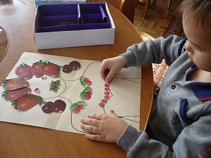 Описание игры: детям предлагается, держа деревянную палочку одной рукой, пытаться нанизывать на неё пуговицы другой рукой. Для тех детей, у которых навык нанизывания пуговиц не автоматизирован, можно начать с нанизывания баранок, сушек.