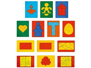 3-й этап освоения игры - это составление фигур из частей по контурному изображению образца или его разрезанному силуэту. При обучении этот тип заданий доступен уже детям 6-7 лет. За играми на составление фигур по образцам следуют упражнения в составлении изображений по собственному замыслу.