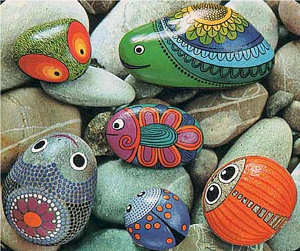 Из раскрашенных и не раскрашенных камней получаются очень красивые оригинальные поделки: бусы, браслеты, амулеты (нужно предварительно просверлить отверстия), картины (на дощечку приклеить камни, выложенные в форме вазы, цветка, рыбки, божьей коровки и т. д.) и др.