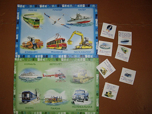 Ход игры: логопед загадывает загадки о разных средствах передвижения. Ребёнок, отгадав загадку, кладёт карточку на поле с изображением этого вида транспорта.