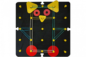 Прежде всего, необходимо познакомиться с игрой. Рассказать, что перед нами игра, которая состоит из чёрного игрового поля (планшета), жёлтых «гвоздиков» (если дети умеют считать, то можно их попросить посчитать, сколько «гвоздиков» в каждом ряду и в каждом столбце), резинок, которые будут нашими помощниками в работе с комплектом, а также деревянных геометрических фигур. Ребёнку нужно рассказать, что у нас есть фигурки разного размера: большие и маленькие. Накладыванием фигурок друг на друга определяем, какие фигурки одинаковой геометрической формы, какие из них большие, а какие маленькие. Далее с помощью резинок делим планшет пополам и просим ребёнка расположить по одну сторону большие фигуры, а по другую – маленькие.