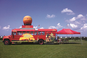Итак, мастера Тригефа приступили к работе. Специально для Кosmos они создали американский школьный автобус. Были раздвинуты сидения и оборудованы полки. Вдоль кузова растянули транспаранты, которые привлекали внимание. Недостающей деталью был водитель. Кosmos хотел не просто профессионального водителя, но и человека, которому бы нравился гибкий график, игры и общение и ростом обязательно между 1, 75 и 1, 85 м, потому что сидение в автобусе нерегулируемое. Все, кто ниже ростом, просто не смогут достать до педалей, и сделано это неслучайно, ведь автобус всегда открыт, и детишки могут залезать и на водительское сидение.