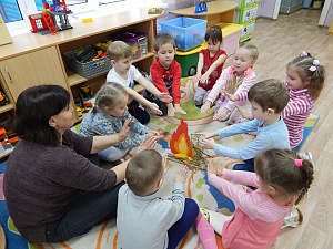 Как огонь появился в пещере? (Дети высказывают свои предположения, затем сообщаю им версию о том, что человек принёс зажжённую молнией горящую ветку и стал поддерживать огонь, добавляя в него новые ветки.) Педагог: Позже люди научились разжигать огонь. Посмотрите, как они это делали. (Демонстрирую фрагмент видеозаписи, на которой охотник разводит огонь с помощью трения сухой деревянной палки и дощечки.) Попробуйте сильно потереть ладошки друг о друга. Какими они стали?