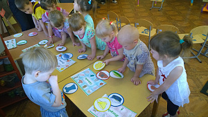 Воспитатель: А вот и наш товар. (На цветных кружках — синего, красного, зелёного, жёлтого, оранжевого цветов — наклеены картинки с изображением товара, соответствующего отделам.) Теперь наведите порядок — разложите товары в соответствии с отделами магазина.