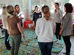Педагог 2: Когда мы предъявляем свои требования к ребёнку, используя частицу «не», мы затрудняем ему понимание этого требования. Сделайте сейчас то, что я скажу: «Не смотрите вверх. Не сидите. Не ставьте ногу на пол». А теперь так: «Посмотрите вперёд. Встаньте. Поднимите правую ногу». Предлагаю выполнить такое упражнение: каждый из вас по очереди встаёт в красный обруч, я произношу своё требование с частицей «не». Ваша задача – переформулировать требование, произнести его вслух без частицы «не» и перейти к зелёному обручу.