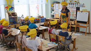 Воспитатель: Посмотрите, какая красивая коробочка здесь стоит? (Коробка с двойным дном.) Что же в ней лежит? Давайте посмотрим. (В коробке лежат поварские колпаки и фартуки.) Что это? Для чего они необходимы? Как вы думаете, что мы сегодня будем делать? (Размышления детей.) А здесь ещё и приглашение есть, давайте прочитаем:Дорогие ребята, приглашаем вас в нашу школу поваров. Ну что, принимаем приглашение?