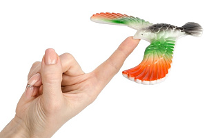 Это игрушка с необыкновенными свойствами равновесия. Расположите носик птички на горизонтальной шероховатой поверхности и убедитесь в том, что игрушка «парит». Можно немного качнуть птичку за крыло, она всё равно удержит баланс и не упадёт. Предложите ребятам подумать, как достигается эффект, какие физические силы воздействуют на птичку. Конечно, одна из них – это сила тяжести. И если бы была только одна она, наша птичка падала вниз, соответственно закону Ньютона. Но на игрушку действует и сила реакции опоры, которая «находится» на кончике клюва. Если точка опоры выше центра тяжести возникает устойчивое равновесие.Проведите дополнительный эксперимент. Нужно взять заточенный карандаш и воткнуть в него согнутый под прямым углом перочинный ножик. Вы наглядно убедитесь, что полученная конструкция будет устойчиво стоять на кончике пальца, несмотря на то, что карандаш «угрожающе» наклоняется.