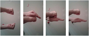 Сначала проводится предварительная беседа: сколько всего дней в неделе; какой первый день, второй, и так далее; сколько рабочих дней; сколько выходных. Дети поочередно сгибают пальцы одной руки, начиная с указательного, и называют последовательно дни недели; суббота и воскресенье обозначаются разжиманием и сжиманием всех пальцев в кулак. На следующем этапе одновременно работают пальцы обеих рук.Назови слово