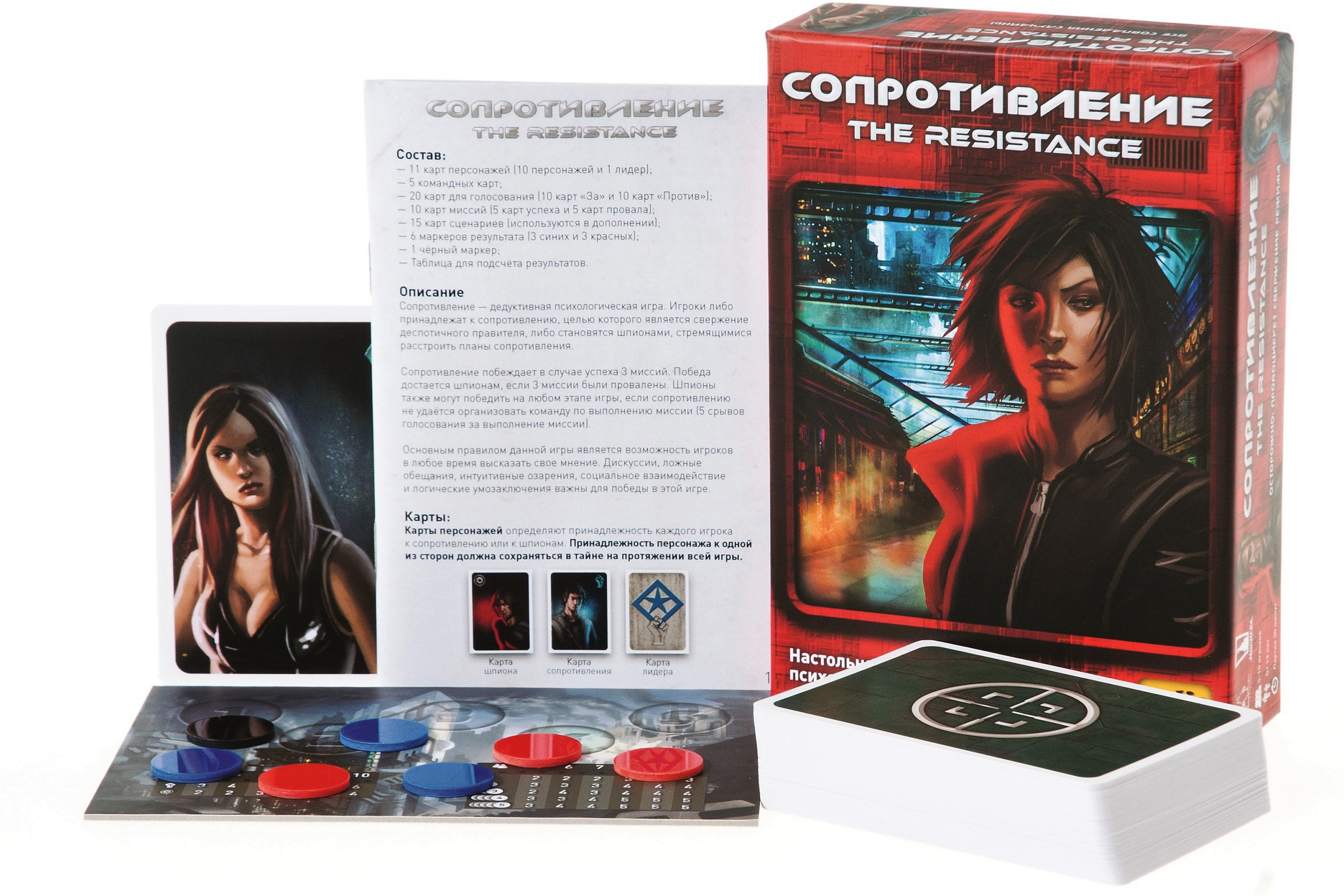 В коробке «Сопротивления» 11 карт персонажей, пять командных карт для отправки бойцов на миссии, карты для голосования (по 10 карт «за» и «против»), карты миссий (по пять карт «успех» и «провал»), игровое поле, правила игры и сюжетные карты дополнения «Закулисные войны» для опытных участников политических игр.