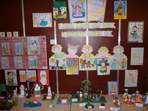 Материалы и оборудование: выставка детских книг, портреты писателей-сказочников, телевизор, игрушки: колобок и лиса, шифон-материя, би-бо-бо: старик и старуха, детская посуда и муляжи медицинских инструментов.