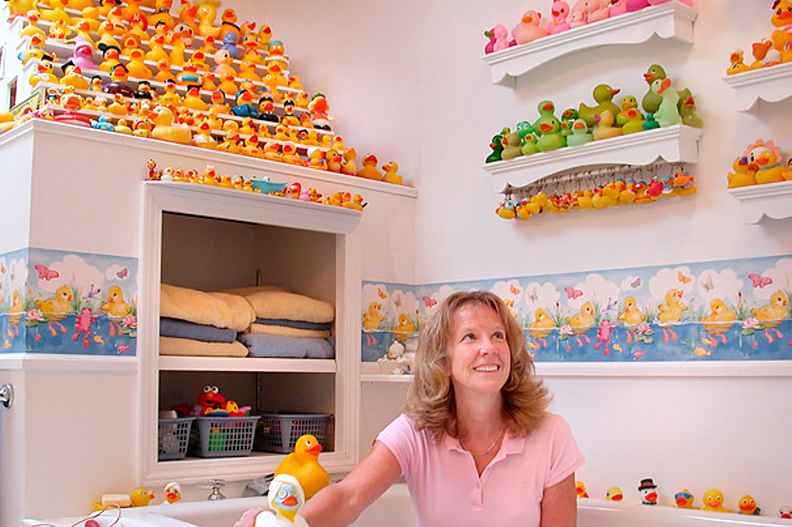 4. Резиновая уточка — обязательная игрушка, наверное, каждой ванной комнаты. С этой игрушкой обычно весело купаются, а вот Валли Хаммер стала их коллекционировать. Коллекция её резиновых уточек не признана крупнейшей в мире, хотя нет ни одной повторяющейся уточки. Энтузиастке не хватило всего несколько сотен, чтобы побить мировой рекорд. А, между прочим, сейчас она владеет 2469 утками.