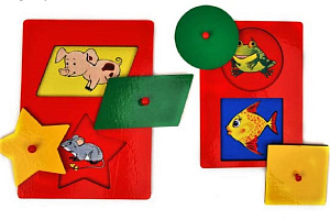 Эта игра будет интересна и полезна для всех детей, но особенно она полезна детям с двигательными нарушениями и зрительной патологией. Крупный размер вкладышей удобен для зрительно-тактильного обследования предмета, а удобная ручка способствует формированию «щипкового» захвата. Хорошо то, что данное пособие автодидактично, то есть здесь верным является только одно правильное решение – невозможно закрыть треугольной «дверкой» прямоугольный «домик».
