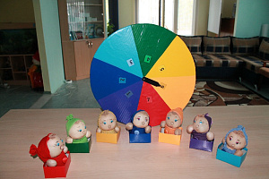 Материалы: куколки-семицветики, домики для кукол, круговая диаграмма — модель недели* (понедельник — фиолетовый, вторник — синий, среда — голубой, четверг — зелёный, пятница — жёлтый, суббота — оранжевый, воскресенье — красный), указательная стрелка, сюжетные карточки по дням недели.