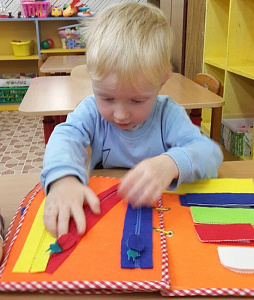 Задачи: развитие познавательного интереса, упражнение в выделении и назывании цвета предметов (красный, синий, жёлтый), развитие мелкой моторики рук.Материал: фетровая страница яркого цвета и цветные молнии (синяя, красная, жёлтая), на замочках маленькие жучки тех же цветов.