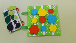 Рядом на отдельной странице необычная игра с тремя зафиксированными вертикально репсовыми лентами. На каждой ленте по три подвижных кружка с липучкой в центре. С боку страницы откидная деталь с цветочками и листьями трёх цветов и трёх размеров. Детали крепятся на липучку. Задания зависят от возраста и задачи, поставленной педагогом. Здесь ребёнок знакомится с размером: маленький, средний, большой, расширяя словарный запас словами «больше» и «меньше». Можно предложить расположить цветы одного размера по рядам или столбикам, то же самое задание может быть по цвету цветочков или оттенку листочков. Ребёнок развивает умение ориентироваться на плоскости, знакомится с вертикальным, горизонтальным и диагональным расположением деталей. Идёт активизация в речи слов «выше», «ниже», «право», «лево», «между». В усложнённом варианте заданий развивается логическое мышление и формируется математическая речь: расположи в ряд слева направо жёлтые цветы в убывающем порядке, справа налево красные цветы в возрастающем порядке и т.д. И, пожалуй, самое сложное задание как для ребёнка, так и для взрослого: расположи все цветы так, чтобы они в каждом ряду и в каждом столбике не повторялись ни по цвету, ни по размеру. Подобная игра является начальным этапом в знакомстве ребёнка с таблицей. В игре малыш знакомится со столбцами, рядами, диагональю, употребляет в речи правильные математические фразы, учится ориентироваться в пространстве.
