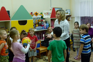 Педагог: Смотрите, мы не заметили сундук! А в нём волшебные шапочки! Знаете ли вы, как называются у наших гостей детёныши? (Ответы детей.) Сейчас проверим! Кто правильно ответит на вопрос, тот превратится в этого малыша! Вставайте скорее в круг, мы с вами поиграем! (Дети встают в круг. Педагог встаёт в середину, по очереди бросает мяч детям, называя животное. Дети называют детёныша этого животного и получают шапочку. После этого звучит весёлая музыка, зверята танцуют.)