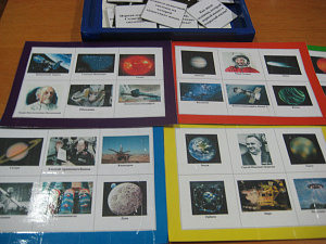 Игра «Путешествие в Космос» представляет собой набор игровых полей, карточек-фишек с вопросами и разрезных карточек с изображениями. На игровом поле находятся шесть изображений, а на карточках-фишках – вопросы. Ответ на вопрос располагается на одном из изображений игрового поля. Таким образом, в игру дети могут играть вместе со взрослым, а также и самостоятельно, если владеют навыками чтения. Вопросы подобраны, исходя из интересов детей, а также знаний, которые они должны усвоить в образовательной области «Познавательное развитие».