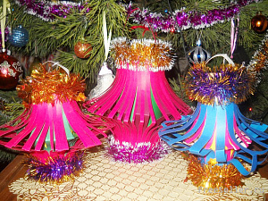 Воспитатель напоминает детям о занятии, на котором беседовали о новогодних традициях, об украшении домов к Новому году. Символом новогоднего праздника является ёлка. Очень приятно, когда на ёлке висят не только игрушки, купленные в магазине, но и выполненные своими руками.Воспитатель предлагает детям изготовить новогодние фонарики из бумаги. Обращает внимание на то, что, даже используя такой простой материал, как бумага, можно получить оригинальные и красивые украшения.