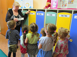 1. Прочитай и покажиС помощью сигнала барабана педагог приглашает детей подойти, затем предлагает найти и показать предметы мебели в разных помещениях группы. Он демонстрирует табличку с подписью ШКАФ, дети читают слово. Педагог предлагает им показать какой-либо шкаф. В групповой комнате это шкаф с играми или предметами для изобразительной деятельности, в раздевалке - шкафы с детской одеждой и сушильный шкаф, в классе - шкаф с книгами.