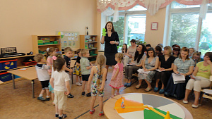Воспитатель: А поможет нам в этом волшебный круг! Давайте подойдём к волшебному кругу, возьмёмся за руки, закроем глазки и скажем волшебные слова. (Воспитатель раскручивает ленточку на оранжевом окошке. Дети вместе с воспитателем берутся за руки, хором произносят слова.)