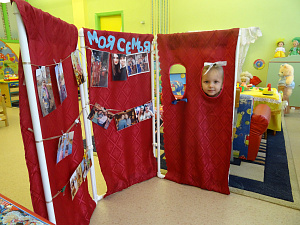 В группах раннего и младшего возраста ширмы оформлены в виде корабля, автомобиля, поезда и легко сменяются целиком в зависимости от игровой ситуации. В группах среднего и старшего возраста на обтянутых тканью ширмах предусмотрены детали для крепления картинок, декораций, занавесок и другого материала, необходимого по сюжету разных игр. Например, в игре «Поликлиника» при опускании части ткани на ширме появляется окно «Регистратура», а при дополнении ширмы занавесью дети играют в сюжетно-ролевые игры «Театр», «Концерт», «Телепередача». Для игры «Парикмахерская» достаточно прикрепить к ширме карманы с инструментами, журналами, аксессуарами. При перемещении соединительных креплений ширму легко можно превратить в палатку, корабль или дом. В этом случае имеющееся на ней оформление снимаем.