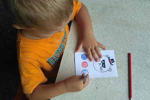 Воспитатель: Какой красивый котик! Я, кажется, догадалась, ты хочешь, чтоб мы научились различать звуки, тут 3 кружочка и в названии этого животного 3 буквы! Но, буквы мы пишем и читаем, а то что мы слышим называется звуками. Есть речевые звуки, которые нужны нам, чтобы разговаривать. Звуки бывают длинными и короткими, одни можно пропеть, и они обозначаются красным цветом. А есть те, которые не поются, короткие, и мы их обозначаем каким цветом? (Синим.) Кто изображён у вас на листочках? (КОТ.) Какой первый звук мы слышим в слове кот – «К» Его можно спеть? (Нет.) Значит, он будет… (Синим.) А звук «О» мы закрасим каким цветом? Почему? (Далее разбираются аналогично остальные звуки слова «КОТ».) Кто запомнил, в какой последовательности нужно закрашивать звуки? Катя расскажи нам и прикрепи наши звуки в правильной последовательности. (Ребёнку даётся демонстрационный материал. Если воспитанник затрудняется, воспитатель помогает.) Дети, возьмите синий карандаш и закрасьте первый кружочек, кто выполнит задание, поднимите руку, и ваш кот получит шляпу. (Дети выполняют. Воспитатель раздаёт шляпы, потом при закрашивании второго кружочка – очки, третьего – бантик.) А теперь возьмите клей-карандаш и приклейте к котику шляпу, очки и бантик. Давайте теперь дотронемся до каждого кружочка и произнесём звук, который он обозначает! «К», «О», «Т», а вместе – получилось слово «КОТ».
