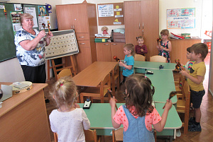 Педагог: А теперь называйте мне музыкальный инструмент, который указан на табличке. Это барабан. (Один ребёнок прочитывает табличку. Педагог играет на барабане. Дети выполняют движения: шаги на месте, и произносят Та-та-та.) Как называется эта игрушка? (Педагог играет на пианино. Дети прочитывают табличку. Педагог играет, а дети выполняют движения и произносят Ля-ля-ля. (Вращение кистей рук перед грудью.) Послушаем ещё одну игрушку. (Педагог играет на гармошке. Дети выполняют движения: руки на поясе, вращения туловищем с небольшим приседанием. Прочитывается табличка.) А вот бубен, послушайте. (Педагог стучит по бубну, позванивая бубенцами. Дети выполняют движения: хлопают в ладоши, затем прочитывают табличку.) Следующая музыкальная игрушка – дудка. (Педагог играет на дудке, дети имитируют игру на дудке и произносят У-у-у-у-у-у... Прочитывают табличку. Все таблички выставляются на доске.)